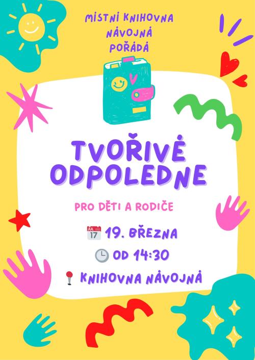 Místní knihovna Návojná srdečně zve na TVOŘIVÉ ODPOLEDNE pro děti a rodiče, které se bude konat ve čtvrtek 19.3. od 14:30 hod. Přijďte si společně užít příjemný čas plný kreativity, vyrábění a dobré nálady!