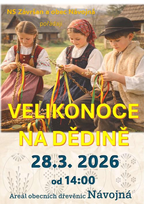 Národopisný soubor Závršan Vás srdečně zve na velikonoční odpoledne, které se uskuteční v sobotu 28. března 2026 od 14 hodin v areálu obecních dřevěnic v Návojné. Můžete se těšit na příjemně strávené odpoledne s velikonoční atmosférou.