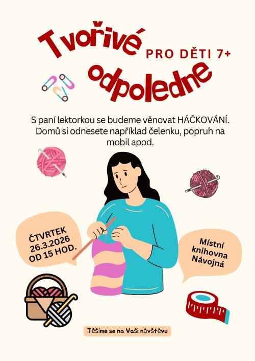 Knihovna Návojná vás srdečně zve na tvořivé odpoledne - pro menší i větší děti ve čtvrtek 26. 3. 2026 od 15:00 hod v knihovně. Děti od 7 let se budou s paní lektorkou věnovat HÁČKOVÁNÍ - vyrobí si např. čelenku nebo popruh na mobil; menší děti si vyrobí velikonoční zajíčky z barevných provázků.