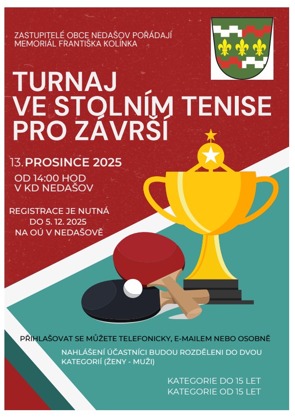 Zastupitelstvo obce Nedašov zve na MEMORIÁL FRANTIŠKA KOLÍNKA - TURNAJ VE STOLNÍM TENISE PRO ZÁVRŠÍ 2025 - 13. 12. 2025 od 14:00 hod. v KD Nedašov.