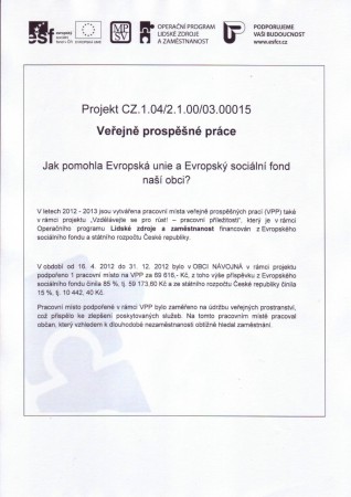 V období od 16. 4. 2012 do 31. 12. 2012 bylo z prostředků EU a ESF podpořeno vytvoření dalšího pracovního místa v rámci Veřejně prospěšných prací na úklidu a údržbě obce. Práce pracovníků v rámci VPP je na vzhledu obce znát a zároveň přispívá ke snížení nezaměstnanosti v naší obci.